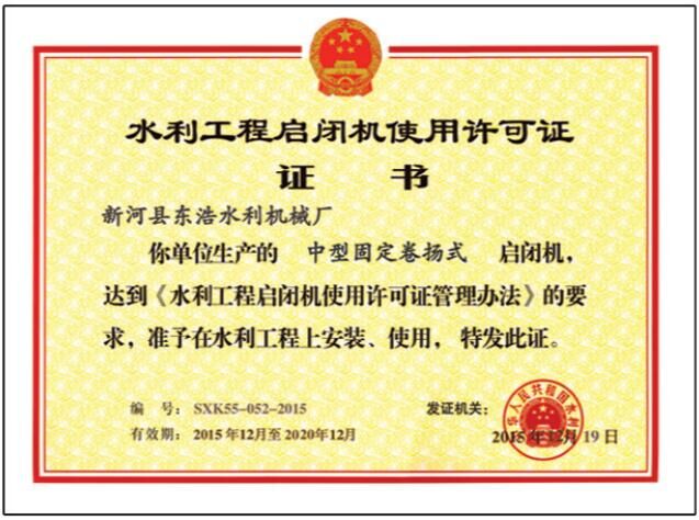 产品符合SL41-93《水利水电工程启闭机设计规范》、SD297-88《QL型螺杆式启闭机系列参数》、 SD298-88《QL型螺杆式启闭机技术条件》、SD315-89、SD296-83等系列国家标准, 多次受到省、市政府部门的嘉奖,并由水利部、农业部授予推荐品牌。 凭过硬的产品质量和合理的产品价格,在全国的水利水电工程建设项目中多次中标, 为水利水电建设做出了卓越的贡献。